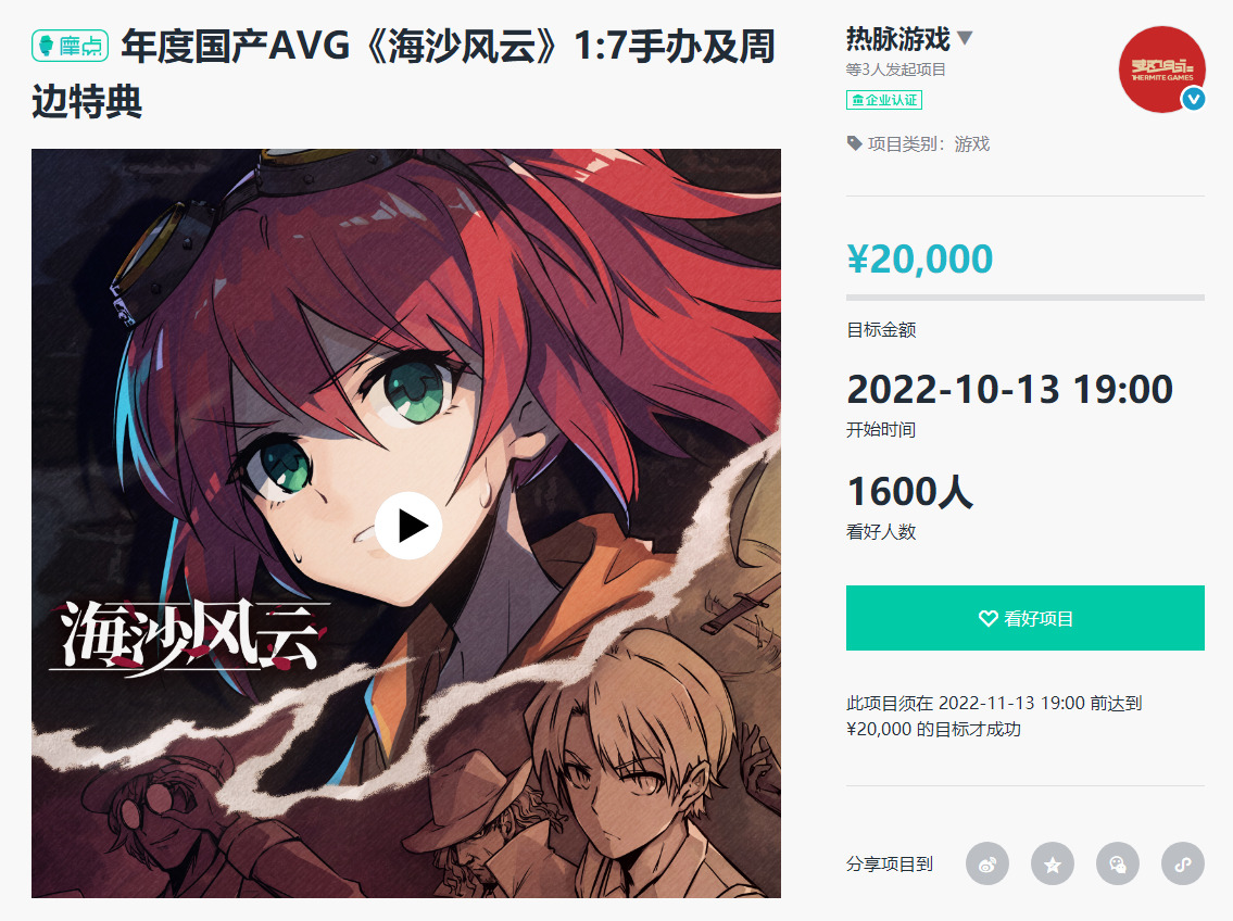 【2022年10月13日,北京】今日,由异美工作室开发、热脉游戏发行的文字冒险游戏《海沙风云》的周边众筹项目已在【摩点】、【Kickstarter】平台正式开启。该项目提供了种类繁多的游戏周边与典藏礼盒供玩家选择,包括立牌、签名板、柯罗莎同款水晶项链等多档回报,更特别设计了精致的1:7柯罗莎手办回馈粉丝。此外,《海沙风云》或将借助众筹项目登陆PS5/PS4/Switch平台,并新增英语、日语两种文本语言。