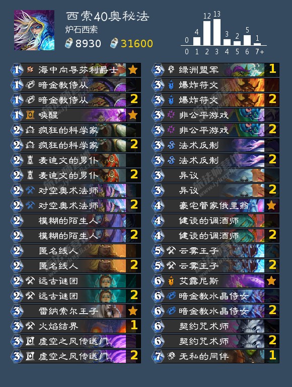 大家好我是西索,今天用奥秘法从300多名80多高胜率打到61名,因为癫狂公爵的削弱,高分段很多otk都提前开始出来了,奥秘法打鬼灵贼等otk真是一把好手,还能优开海盗贼和偶数萨等快攻卡组。