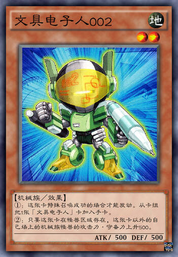 该卡登场于902,等级为2。刚开始发售001时,由于效果中并没有字段化,所以当时的玩家并不认为这会成为一个字段,不过002这张卡的效果令「文具电子人001」检索字段化,从「文具电子人002」检索的是「文具电子人」卡而非「文具电子人001」怪兽这点来看,当时还有人认为未来会有「文具电子人001」名的魔法陷阱。