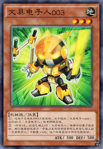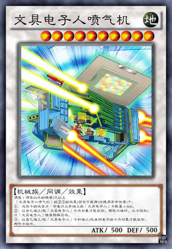 登陆于908,合计加攻的效果也比较符合它的造型,不过这并不能让玩家信服,因为在类别上它并不是合体怪兽。相反登陆906的同调怪兽《文具电子人喷气机》才是本家BOSS。