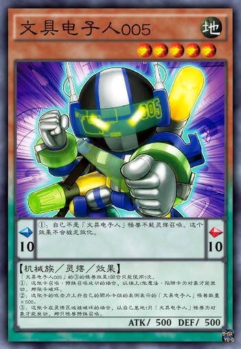 「文具电子人」怪兽统一为地属性·机械族,攻击力·守备力都为500,而等级则随着名称上的编号同步递增。系列内包括了灵摆召唤与同调召唤的系统。