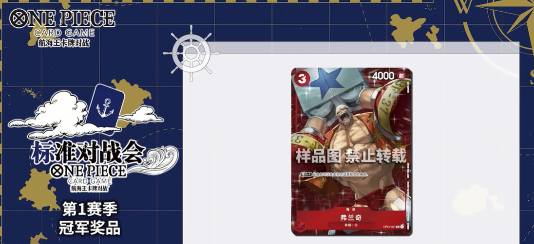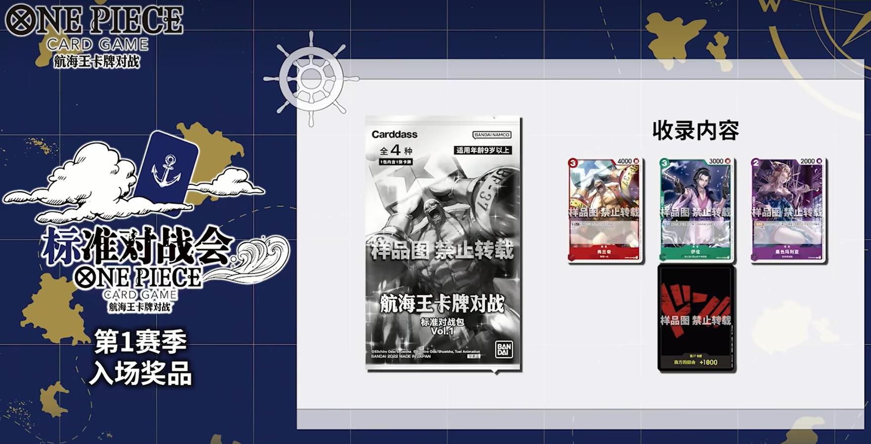 航海王卡牌对战标准对战会将于12月正式展开,标准对战会将以三个月为一个赛季,第一赛季的参与奖为标准对战包Vol.1,优胜奖励为异画版弗兰奇