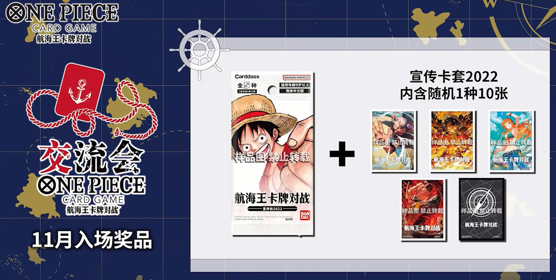 在第一期卡片发售后,11月将举办OPCG交流会活动,是不执著于胜负的超休闲活动,入场可领宣传包一包+宣传卡套一包(随机一种,一包10张)