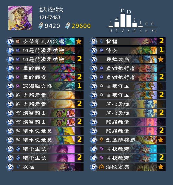 女祭司瓦丽丝琪:在中期可配合其进行超展开,斩杀回合也可以增加斩杀线。但很多情况都是作为纳迦宝宝,或只能复原一两个法力水晶。可用女王护卫替换。