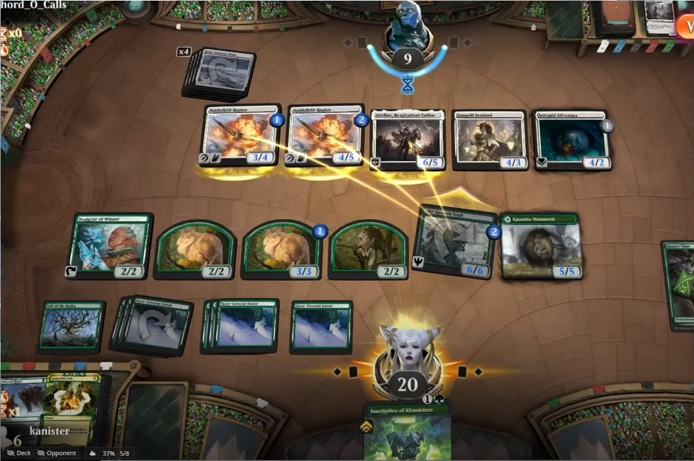 回到图中这个例子,主视角敢这样进攻,说明手里一定有trick(或去除),而如果大家熟悉赞迪卡再起时期的标准环境,会知道丰足铭文当时有多猛。所以我几乎锁定了主视角手里捏着丰足铭文,并以此为前提进行相应阻挡。也许有些人会单纯地认为:“**对面怎么在白给”。 通常而言,对手敢踢总归是有理由的。我在直播时经常会问弹幕,让大家猜对手有什么trick。在限制赛里,往往有六七种以上的常见trick,所以不需要猜得很准确。但要结合对面选择了哪些生物进攻来推测他trick有多大。