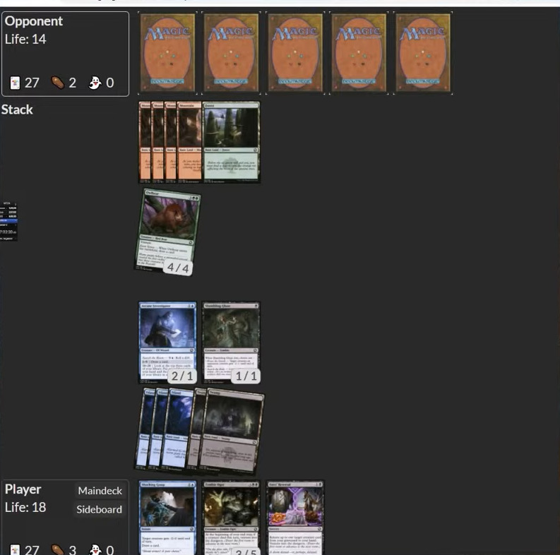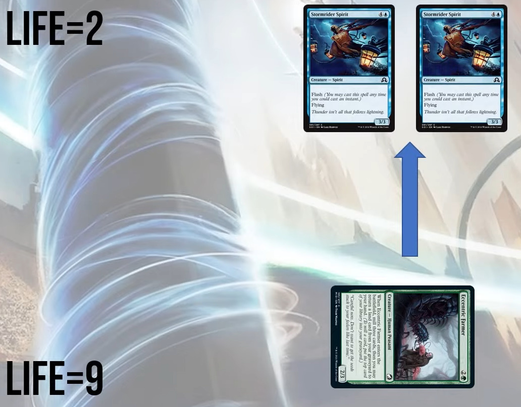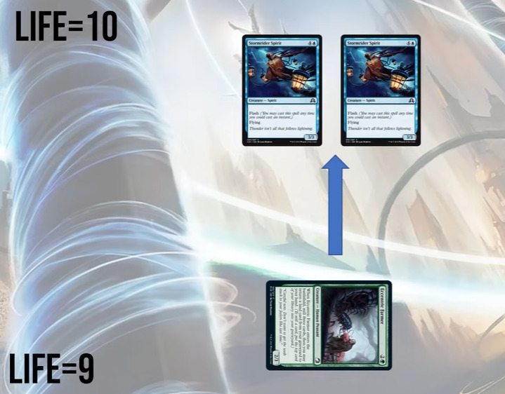 在这个例子里我们已经处于岌岌可危的境地:再过两回合就会两个3/3驭霆精怪clock被踢死。正是因为获胜的希望很渺茫,这个2/3也在阻挡端也没有发挥,我们在这里更应该选择进攻。反而对手可能会因为处于优势,不想让自己的生物被换掉拖慢clock而选择不阻挡。