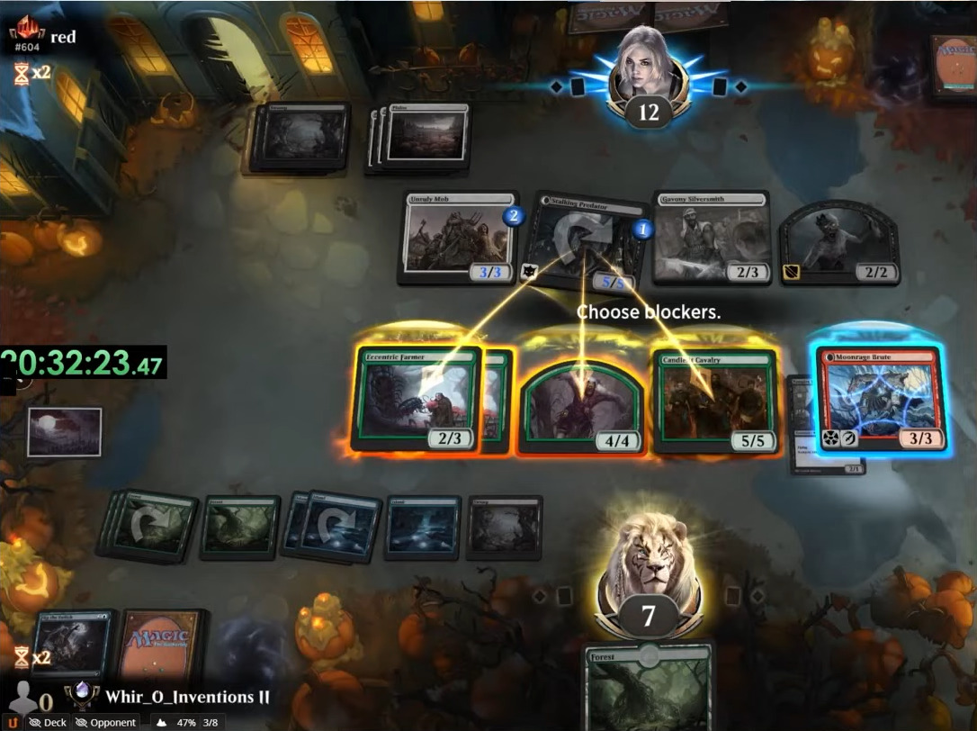 (对局信息:对手用潜行掠狼进攻,我方用古怪农夫,野兽衍生物,烛光骑兵阻挡,月怒蛮狼没有选择阻挡)
