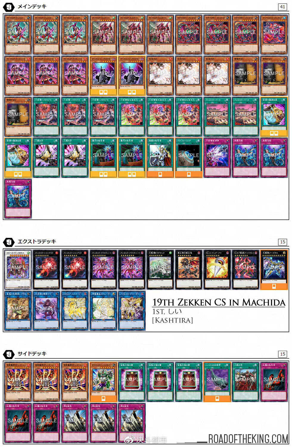 副卡组里的“六世坏·独角兽”和“六世坏他化自在天”提供了一个出“六世坏 亚雷兹哈特”的选项。“六号世坏=帕雷佐斯”可以把“六世坏·独角兽”从卡组加入手牌,然后从手牌特殊召唤。“六世坏·独角兽”效果可以把“六世坏他化自在天”从卡组加入手牌,然后发动“六世坏他化自在天”,把“六世坏·芬里尔”从卡组特殊召唤。“六世坏·芬里尔”效果可以把“壹世坏·六世坏”从卡组加入手牌。“壹世坏·六世坏”可以从手牌特殊召唤,然后除外墓地的“六世坏他化自在天”。之后使用“六世坏·独角兽”、“六世坏·芬里尔”和“壹世坏·六世坏”来超量召唤“六世坏·亚雷兹哈特”。