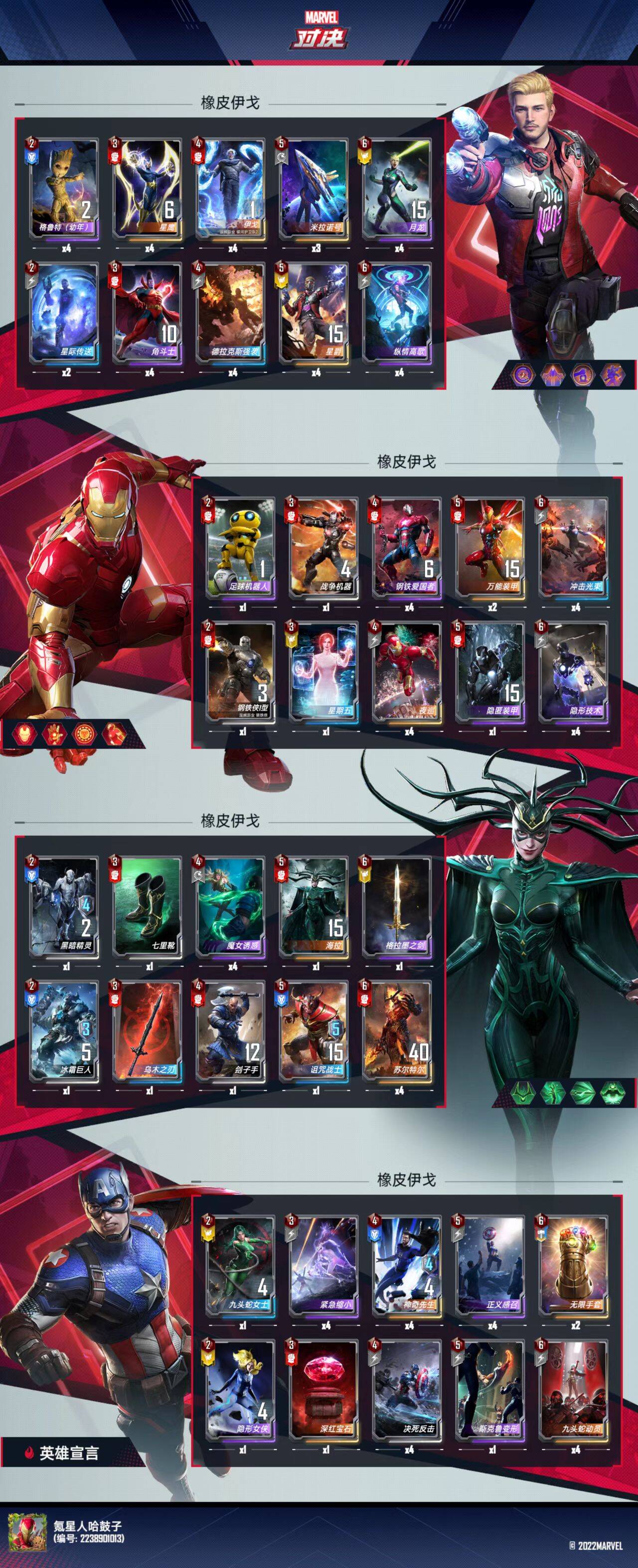 哈喽,大家好,我是氪星人哈鼓子(ID:2238901013),不是哈喇子哦!!!新赛季到来,带来了链接这个新玩法,初看的时候还觉得挺有意思,玩法比较特别,但是等更新之后才知道,激活链接需要4800尘,链接里有两个英雄就得要4800*2的尘,需要的资源太多了,之前的收藏家活动又吃了太多资源,(像我想玩惊队,只有2千尘,卡有80多张可以抽,但是我惊队的英雄都满了,去抽卡的话就是纯纯的亏)除非是氪了好几万的大佬,才能在新赛季一开始就弄出自己想要玩的链接,对我们这种微氪的玩家太不友好了,上赛季的援军橡皮、山火橡皮、蜘蛛瑟西之类的也都玩腻了,最近星爵比较火,我虽然没有尘去弄链接新卡组玩,但是其他卡都还是很齐全的,就自己组了一套橡皮伊戈玩了几把,发现效果还真不错,橡皮配伊戈解决了伊戈1攻破不了敌的尴尬局面,而且卡组带来钢铁侠跟海拉,也不怕海拉终幕了,最近天梯也没碰到过情报卡组,可以说是基本没有天敌,只要前期不是很黑,一直拿不到橡皮这种,起来了基本就是鸡。