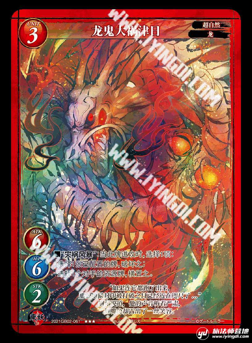我带了4张龙鬼大祸津日这张卡可以有效的恶心k系和挑战者,面对这些职业这张牌自带软嘲讽,而且效果就是只发动一次,被解也十分不错,而且哪怕没有盖牌,面对k系也可以横置资源牌,打乱k系的节奏。我之所以带来4张是因为目前比赛狂战士被针对的略显疲惫,k系已经挑战者开始发力所以我满编了4龙鬼以求破解。