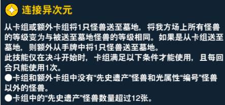 一效发动条件十分宽松,没什么限制和缺点,对于主打R3至R6的先史遗产来说,自选怪兽可以让卡手率大幅下降。如果特招的是图什帕火箭那么还能再次堆墓,方便发动二效。