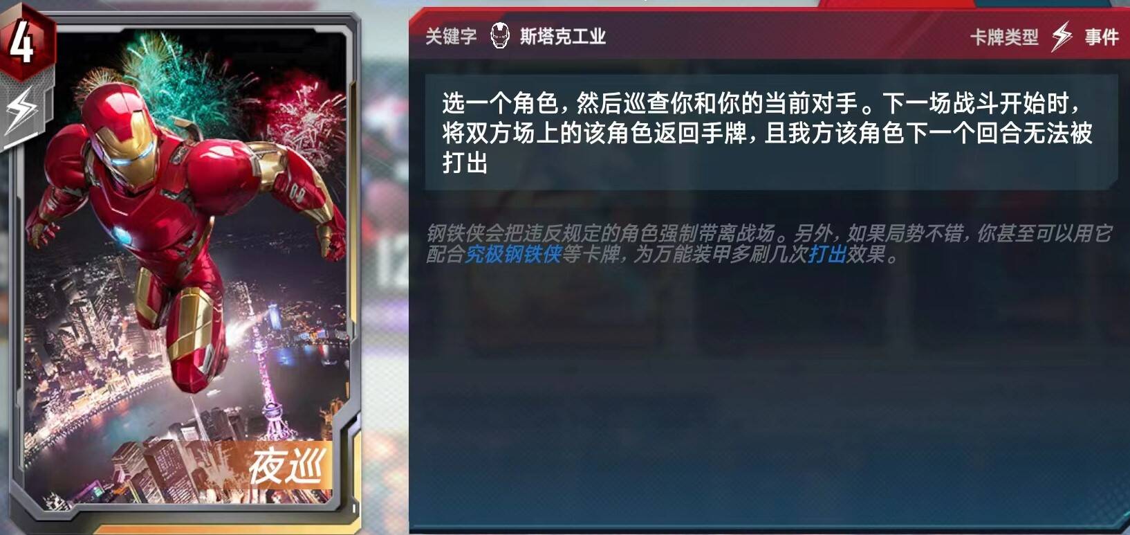 究极钢铁侠亲测太影响感召了,所以换成了夜巡去对抗比较克制我们的古一法师;一张隐匿两张万能就够用了,毕竟卡组越薄越容易找到速趴斯克鲁人。