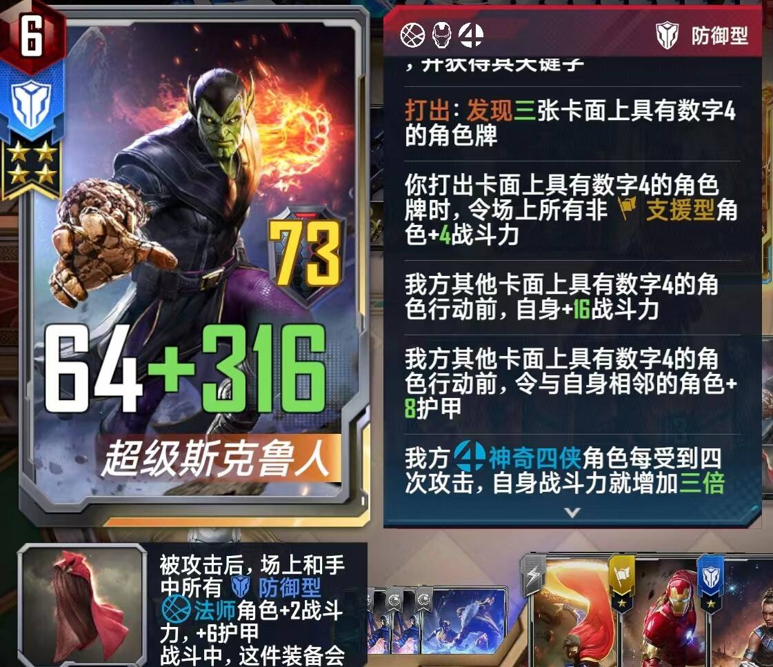 这张卡完美适合斯克鲁人,正巧三块钱的巫医和莫度护甲也都是四点,所以就诞生了神奇四侠、钢铁侠、法师的组卡思路,还剩一个辅助位,选有石头人神装-银武士盔甲和有两张针对卡的万磁王,完美!