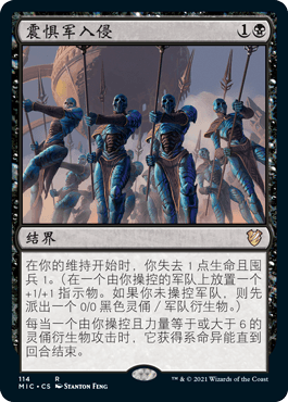主将自己的一效应可以让每个死去的非败朽灵俑创造额外的败朽灵俑token。而二效应在回合末牺牲灵俑赚牌,通过牺牲墓场匍尸/腐臭鬼怪/基拉夫信差/震惧军入侵制造的灵俑/军队衍生物等可以反复利用的灵俑生物获得资源,并且通过无头骑手/不死卜算师/午夜镰刀手之类的效应赚取额外价值。由于败朽灵俑token都是黑色,所以我们很容易凑齐四个黑色生物,让夺命阴谋这张牌变成一张高效的替费去除+滤抽。