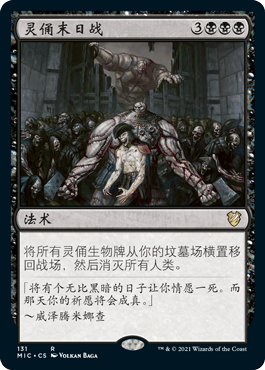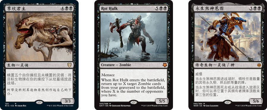主将+孳坟君主+腐尸巨汉+永生煞神芭图+拉佐特裂肢兽/死冥双身(额外生物)+极恶刺蝎/痴呆祭坛等(任意牺牲源):说实话,我有认真考虑过有没有必要把这三个大哥带着一票小弟搭伙过日子称作组合技写进来,但这套确实就是我在店里实际遇到过的(主将带一点灵俑token在场,掘一个孳坟君主出来就达成了),新手不太玩的懂的流程,所以这里把原理阐述一下可能比较好。首先腐尸巨汉这张牌因为是上一个游戏之夜出的单卡,没有中文所以我只收了英文,7费55威慑,当~进战场时,将X张灵俑牌从你的坟墓场移回战场,X为你对手的数量。所以在一场常规四人桌的对局中,在没有对手离场的情况下,它的进场异能可以掘另外三张灵俑生物进战场。这种费用的大哥肯定不会生拍进场,这种时候就要有请我们的另一位展开大哥登场了,孳坟君主可以通过横置五个未横置的灵俑将任意坟墓场的目标生物掘到你的场上,它就是我们的掘坟引擎。永生煞神芭图是套牌中可以牺牲复数生物的灵俑,通过她就可以让掘出来的生物再次进坟。当孳坟君主、主将和3个灵俑生物在场,腐尸巨汉、永生煞神芭图、拉佐特裂肢兽还有任意一个榨取生物在坟墓场(比如极恶刺蝎)时,横置场上五个灵俑掘腐尸巨汉,腐尸巨汉进场异能掘永生煞神芭图、拉佐特裂肢兽,极恶刺蝎,三个生物的异能分别进入堆叠,让拉佐特裂肢兽的异能在堆叠最上方最先结算,派出一个1/1的灵俑军队token,然后在永生煞神芭图异能还在堆叠上的时候,再次启动孳坟君主的异能,横置刚刚进场的腐尸巨汉、永生煞神芭图、拉佐特裂肢兽,极恶刺蝎和1/1灵俑军队token,将任意坟墓场的生物掘进战场。继续结算永生煞神芭图的异能,让她牺牲所有刚刚掘进战场并且被横置的灵俑生物,最后结算极恶刺蝎的榨取异能牺牲永生煞神芭图,这时候主将的异能触发,我们就得到了五个未横置的败朽灵俑token,芭图异能抓的五张牌,掘出来的一个生物和依旧呆在坟墓场的生物们。通过这个循环,我们可以在任意有优先权的时机把任何在坟墓场的生物掘进战场,当然,进行了这么充分堆坟的情况下,大概率我们都可以在回合结束的时候把手牌中的安福陵的暗贾弃进坟墓场,在下一个维持阶段通过重复掘出暗贾制胜。
