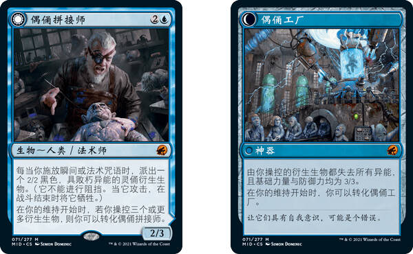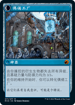 主将+偶俑拼接师//偶俑工厂+痴呆祭坛(任意牺牲源):来自依尼翠本土的助力可不止屋顶风暴,套牌中唯二的非灵俑生物偶俑拼接师(另一个是来自阿芒凯的甲虫神),作为依尼崔研究尸嵌艺术到极致的学者,偶俑拼接师翻面后的偶俑工厂彻底根除了败朽灵俑token的粗糙工艺,让主将制造的败朽灵俑token变成3/3并且失去所有异能,失去了败朽异能的它们获得了阻挡的能力,并且就算死去也可以被主将的效应影响从而再次复活,成了真正的不死者。使用痴呆祭坛献祭不断爬起的尸体也可以直接磨空所有对手的牌库制胜。
