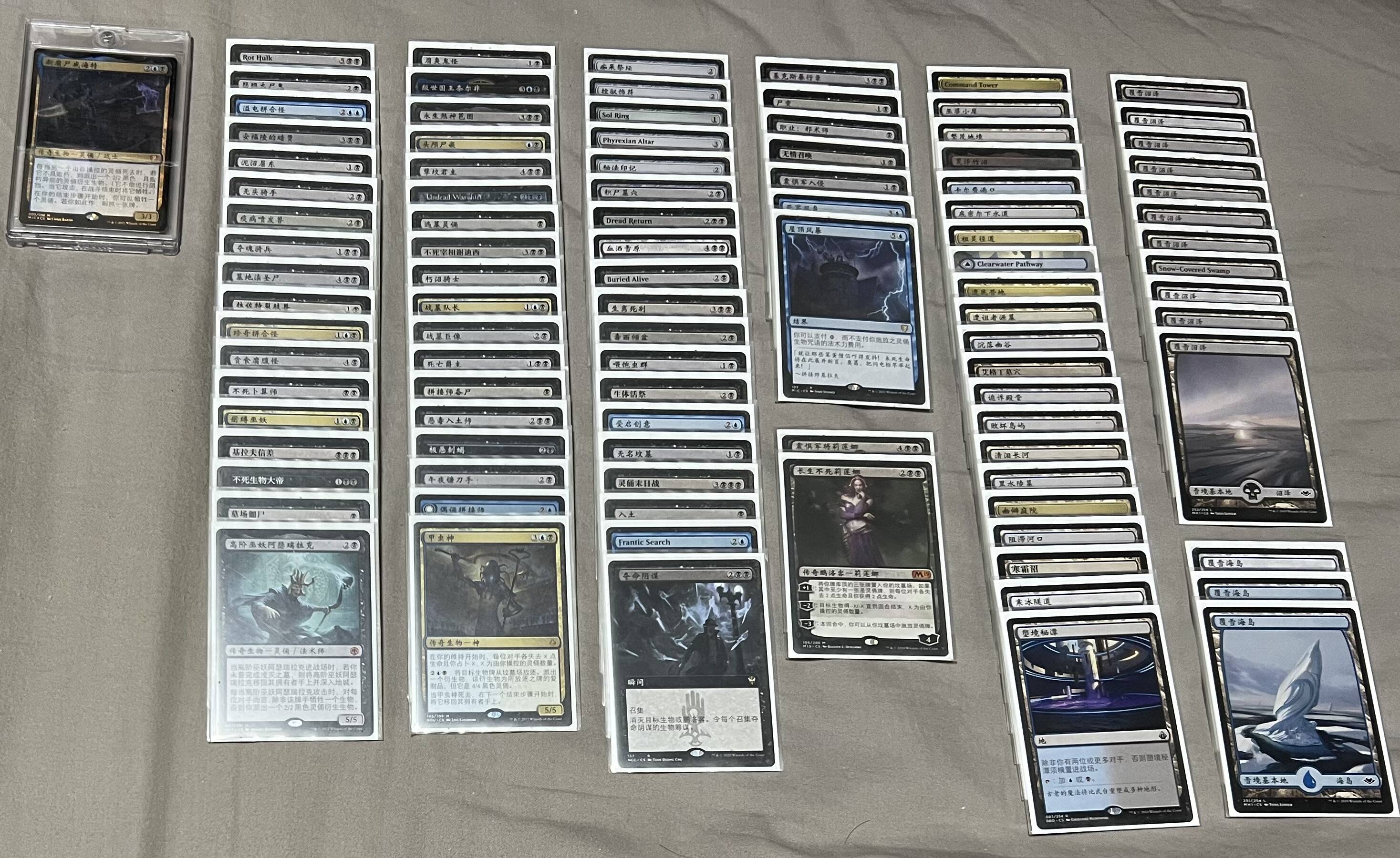 前期通过拼接师备尸/逃墓灵俑/活埋/册缚巫妖/职业:邪术师等单卡快速的积累坟墓场生物数量,然后使用掘坟咒语(尸变/生体活祭/颤栗再现等)让灵俑的高费生物从坟墓场爬出铺开场面。