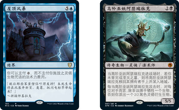 屋顶风暴+高阶巫妖阿瑟瑞拉克:既然说到了屋顶风暴,那就不得不提到这位来自湮灭之墓模组的传奇巫妖了。沐浴在依尼翠闪电中的它获得了新的力量,不再将目光停留在狭小的陵寝……好吧,这套组合技的运行正是基于当我们未完成湮灭之墓地城时,高阶巫妖阿瑟瑞拉克会在进场后深入地城并回手这一异能,通过屋顶风暴将它变成一个免费的深入地城咒语,反复深入凡戴尔的失落矿坑这一地城,每四次深入地城我们都可以占卜1,造一个珍宝,让每位对手失去1点生命,获得1点生命并且抓一张牌,可以在本回合将任意数量的抓上手,由于屋顶风暴的存在,我们可以将手牌任意数量的灵俑免费放进战场,通过安福陵的暗贾等诸多方式获胜。