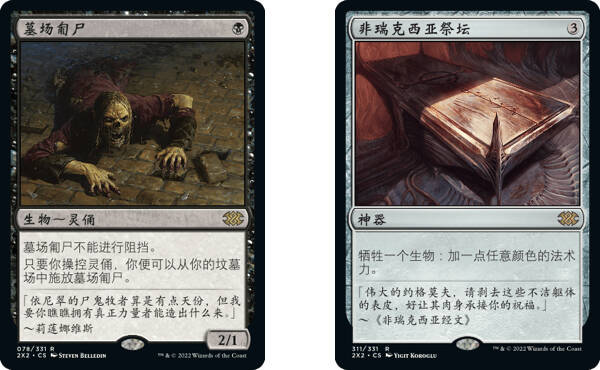 主将+墓场匍尸+非瑞克西亚祭坛/屋顶风暴+痴呆祭坛:因为主将在场,非瑞克西亚祭坛每次牺牲墓场匍尸产黑色法术力,我们都会得到一个额外的败朽灵俑token,然后我们支付黑色法术力从坟墓场施放墓场匍尸,通过不断的循环我们可以得到无限个败朽灵俑token,然后非瑞克西亚祭坛牺牲这些token可以得到无限有色费,配合任意画家效应(战墓队长/疫病喷发兽)可以直接击败所有对手。就算不能直接制胜,对手如果没法处理你这无限个2/2败朽灵俑token,让它们活过维持,你也可以直接通过战斗阶段获胜。并且这是套牌中最容易达成的组合技,通过生离死别单卡导师就可以找齐组件(非瑞克西亚祭坛上手,墓场匍尸进坟)。相比之下虽然主将+墓场匍尸+屋顶风暴+痴呆祭坛也可以直接制造无限的2/2败朽灵俑token+磨空所有对手牌库,但4卡的组合技不说难达成吧,单说结算一个屋顶风暴所制造的优势经常就不需要你通过组合技制胜了。