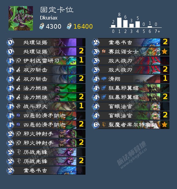 伊利达雷研习:上限牌,缺手牌找滑翔 、古尔丹之颅、幽灵视觉、火色魔印奔行者 ,抢场面找库尔特鲁斯·陨烬 、伊利达雷邪刃武士 ,过墙找吞噬魔法,AOE找恐惧魔王之咬 ,单解找眼棱、混乱吸取,铺场找邪犬训练师 ,干扰找滑翔 、明星学员斯特里娜 ,直伤找甘尔葛战刃铸造师 、考瓦斯·血棘 ,一般情况下不会拿上述之外的牌。而且配合赛丝诺女士一般可以当两发弹药。建议携带1张。