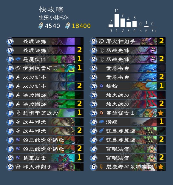 3.选择性留:处理证据,对阵快攻可以留,解关键随从如剑鱼贼的船载火炮;恶魔伙伴,先手在其它两张都是一般不留的牌时可以留下保下限;法力燃烧,其它的牌是对场面帮助很大的牌(如案卷书虫历战先锋等)时留;恐惧牢笼战刃,在有战斗邪犬历战先锋等攻击配合随从时留;战斗邪犬,留的优先级较高,后手有案卷书虫和良好两费节奏时不留;凶恶的滑矛纳迦,留的优先级较高,在后手有案卷书虫和良好两费节奏时不留;邪火神射手,留的优先级很高,两费的优秀节奏,在一费可以拉满(指跳币案卷书虫,手上有狂暴邪翼蝠)且手上有法力燃烧时不留;历战先锋,感觉对手解不掉时留。