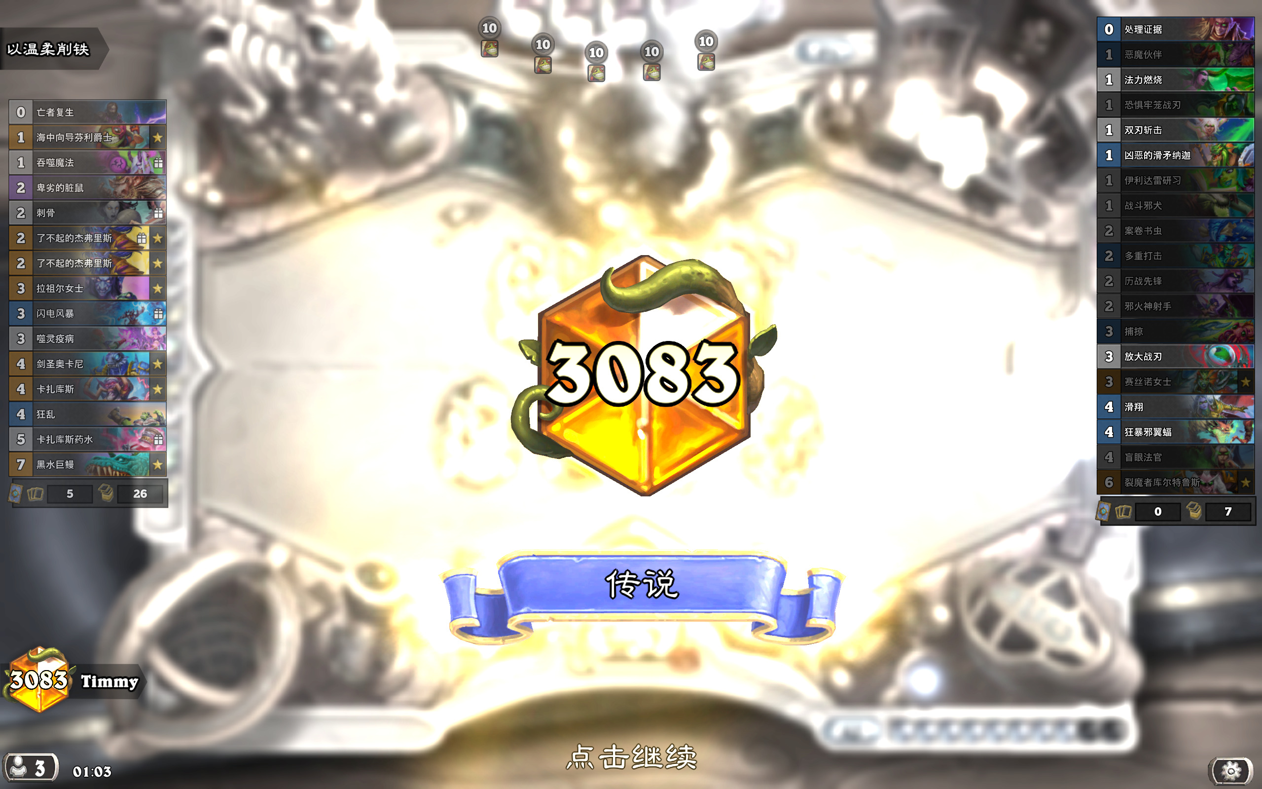 对阵快攻瞎,0-0,大优对局看了我攻略的肯定比没看的厉害多了(手动狗头)。打同行最重要的是认清解随从的优先级。之前打一个宇宙暗牧竟然解凶恶的滑矛纳迦不解邪火神射手,给我看懵了。内战随从的优先级:历战先锋=赛丝诺女士(要看对手手牌多少)>邪火神射手>=克欧雷(要看对手随从多少)>战斗邪犬>=凶恶的滑矛纳迦。但这只是内战的优先级哦,不是所有卡组对阵快攻瞎都是这个优先级的,不过怎么对付咱们这个卡组我才不会告诉你们的呢哼!。