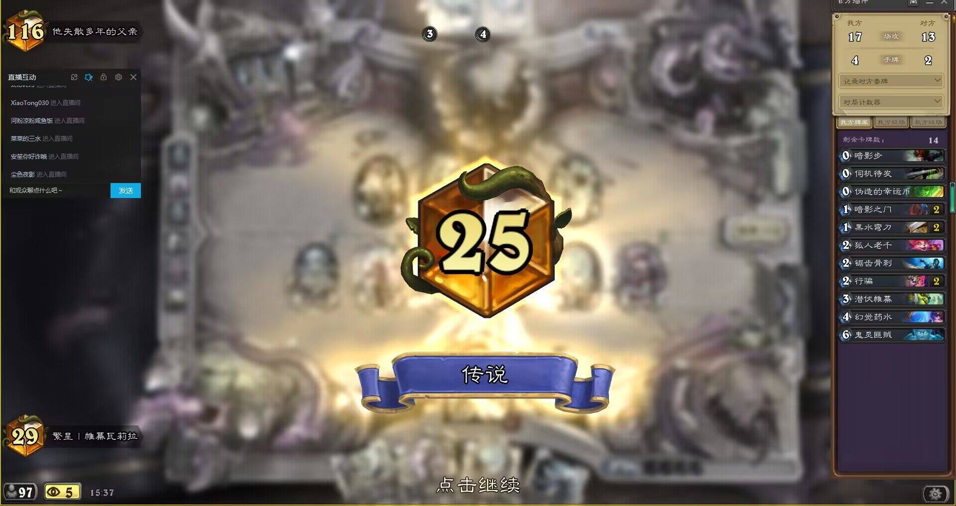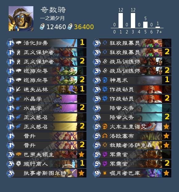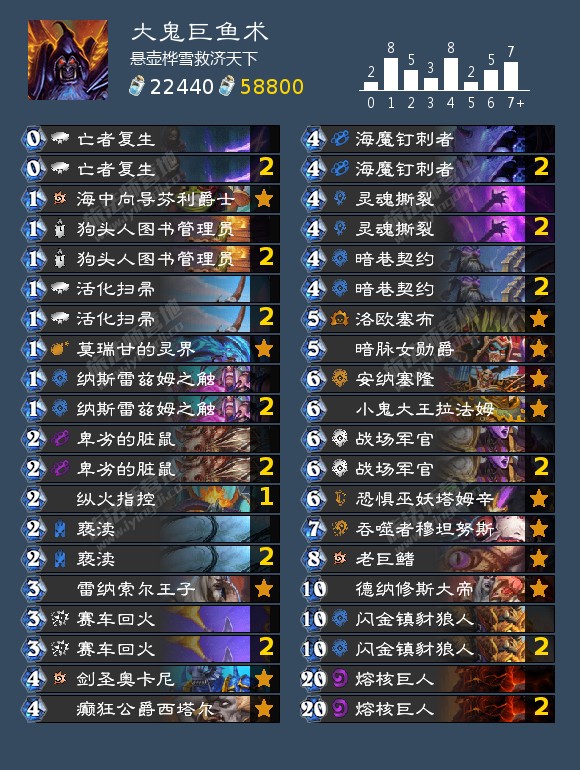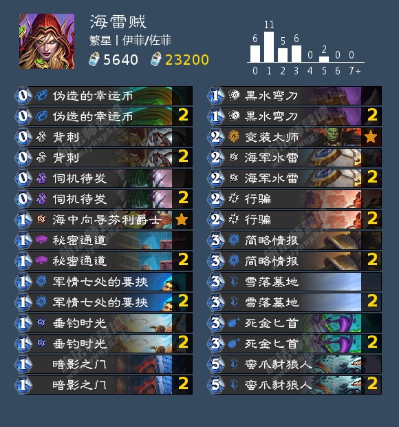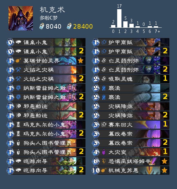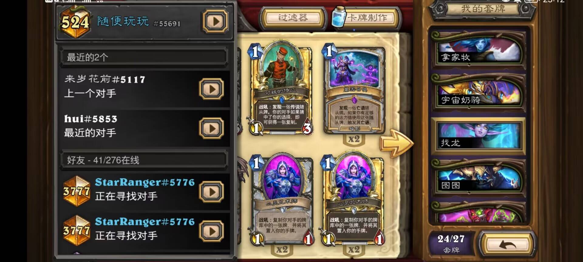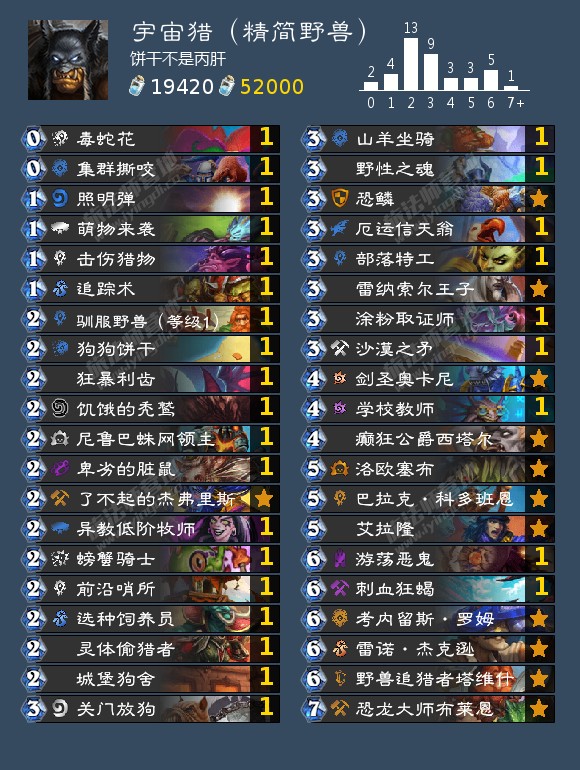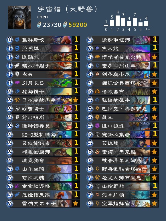 今天的卡组有:大鬼巨鱼术、宇宙猎(精简野兽版)、换家典狱德、宇宙暗牧、海雷贼、控制德、机克术、宇宙猎(大野兽版)、控场型40激怒战、奇数骑、30奥秘法、拿家牧、鬼灵贼。