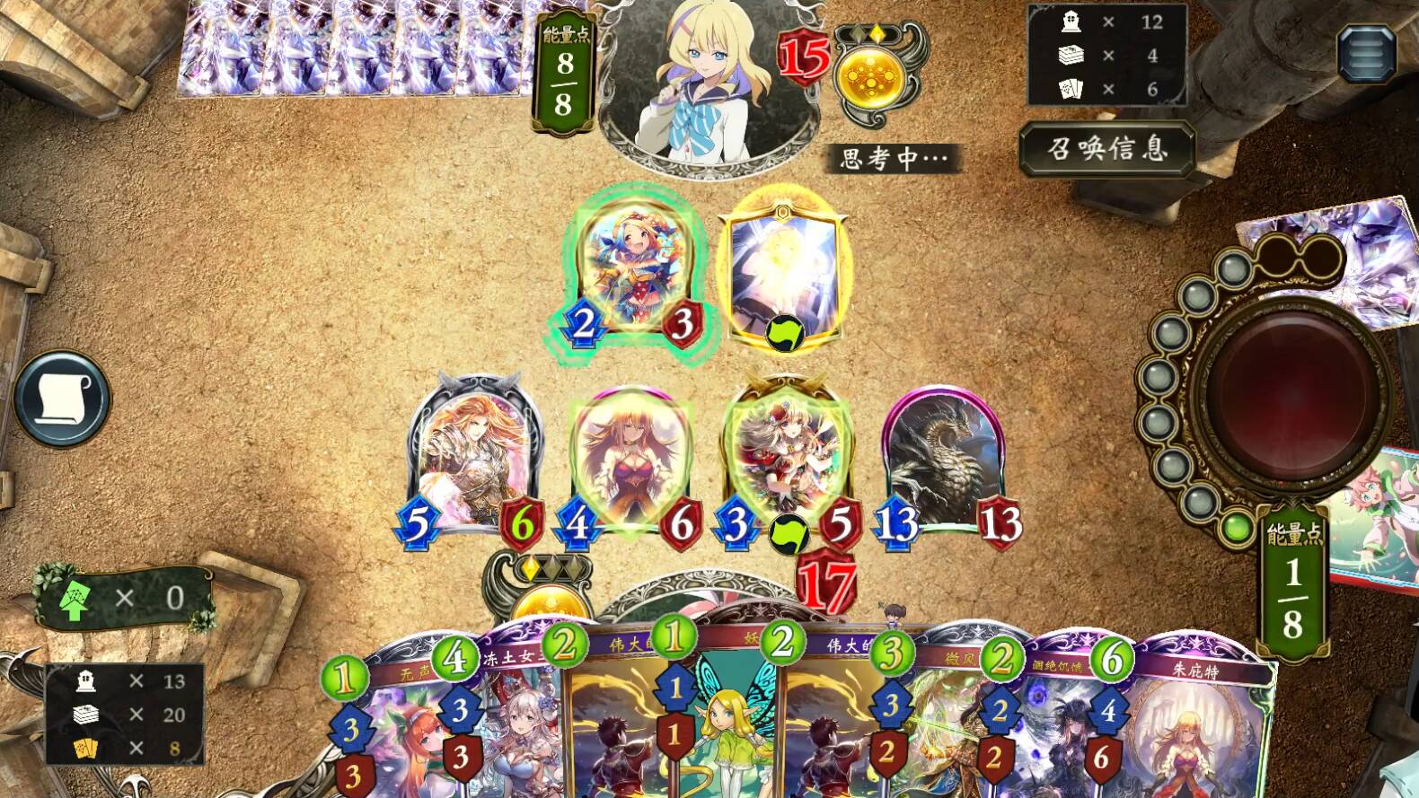 前期优先使用微风精灵。选择合适时机使用绝命的腐蚀解场,没有第2张腐蚀的话,不必在第1回合使用腐蚀;第3回合没有3费牌可用,且对手场攻不高的话,不必在第2回合使用腐蚀。