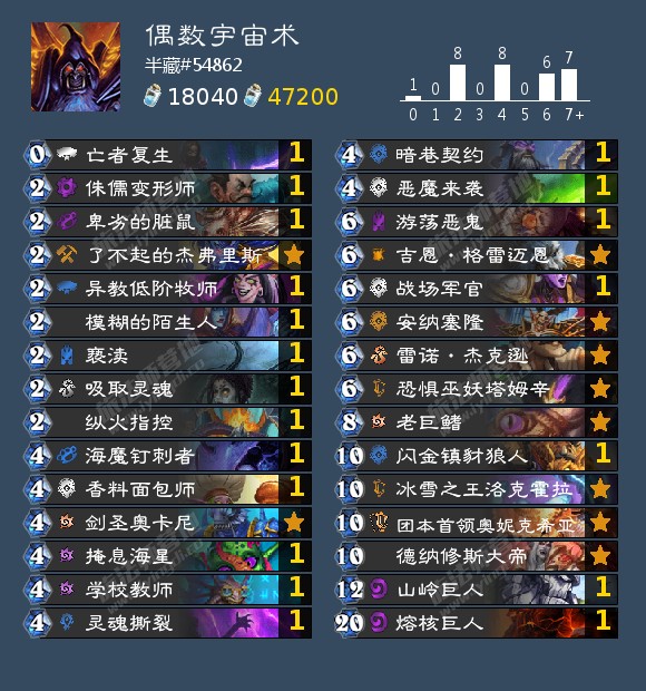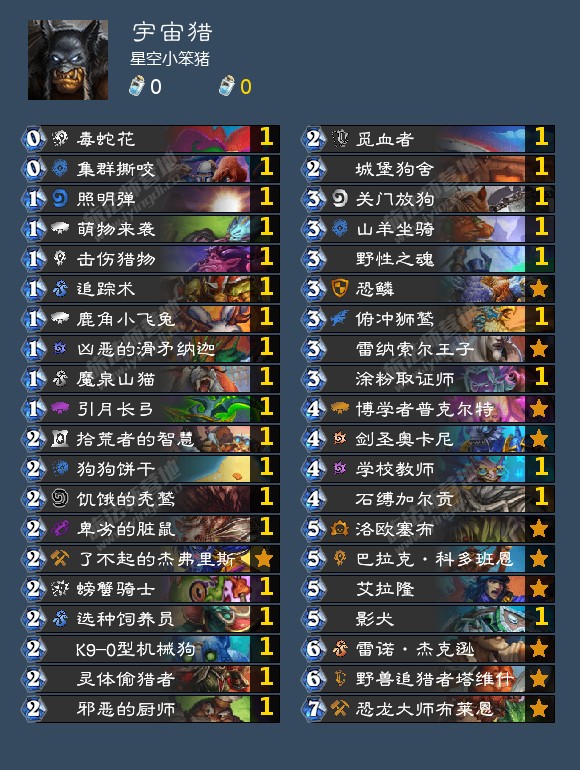 今天的卡组有:宇宙猎、偶数宇宙术、奇迹贼、诅咒术、宇宙暗牧、元气号角骑。