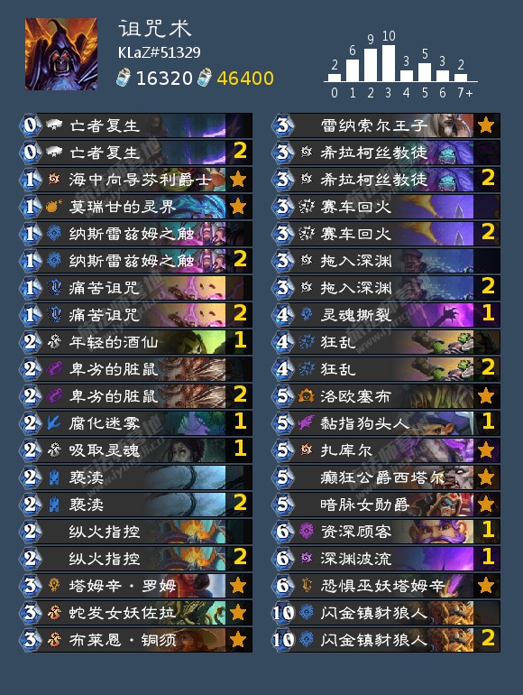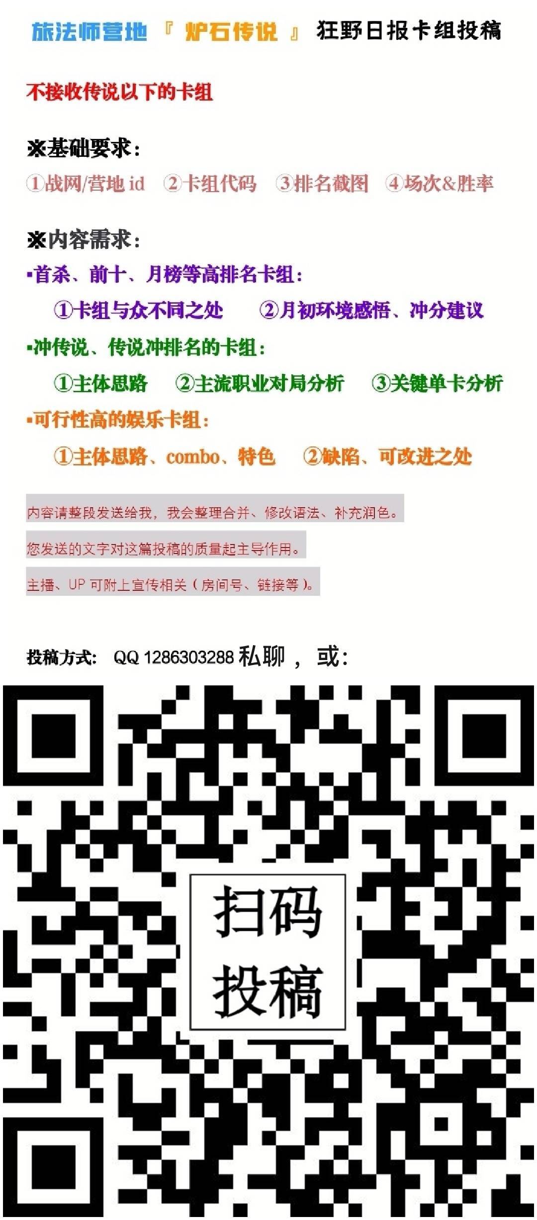 本人觉得诅咒术优开咒鱼术、宇宙暗牧、偶萨等热门卡组。腐化迷雾是从孔雀舞(原id:海马濑人)的宇宙术上学来的思路,打奇迹贼的潜行怪和偶萨的高血量图腾很好用。
