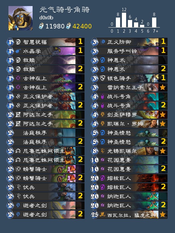 法庭秩序让排序+神圣愤怒的组合技变得更容易打出。号角系统能压缩牌库,欺负慢速、以快打快,凑到2+5就能直接带走一般的30形态卡组。推荐一试。