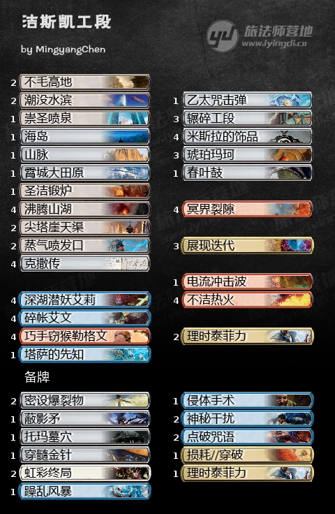 当天比赛我使用了行侣孤兽守卫卡席拉的四色元素,止步八强。这个成绩和四色元素当天给我的体感让我很是纠结,要是很好或很差我就果断换牌或不换了,我很直观的感受到了这牌的一些问题,但它也依然有很不错的抗生物套牌能力。在当天的饭桌上,我们在讨论明天卡豆RCQ玩什么时,高逸也提名了洁斯凯工段,并认为这牌领先于环境。一次巧合两次偶然,第三次听到这个观点时迟钝如我也不禁好好想了想这个选项。