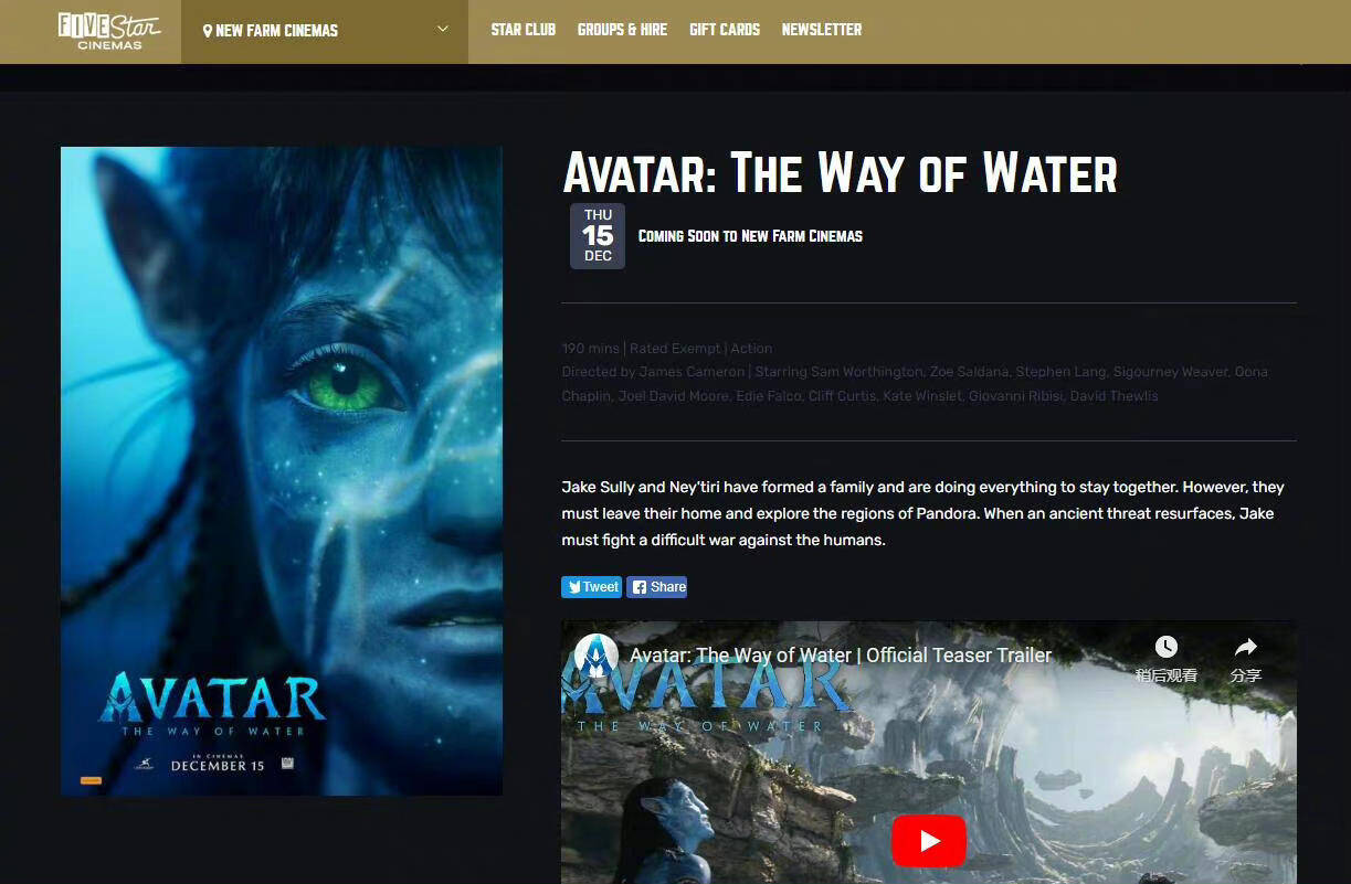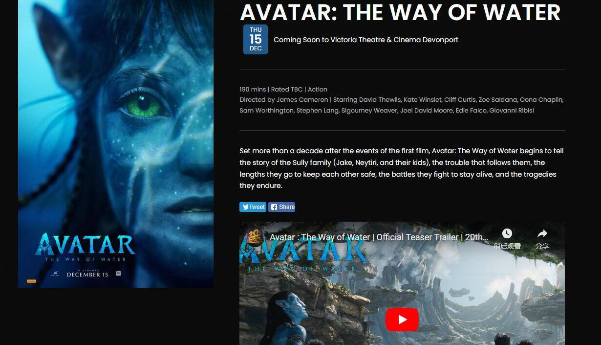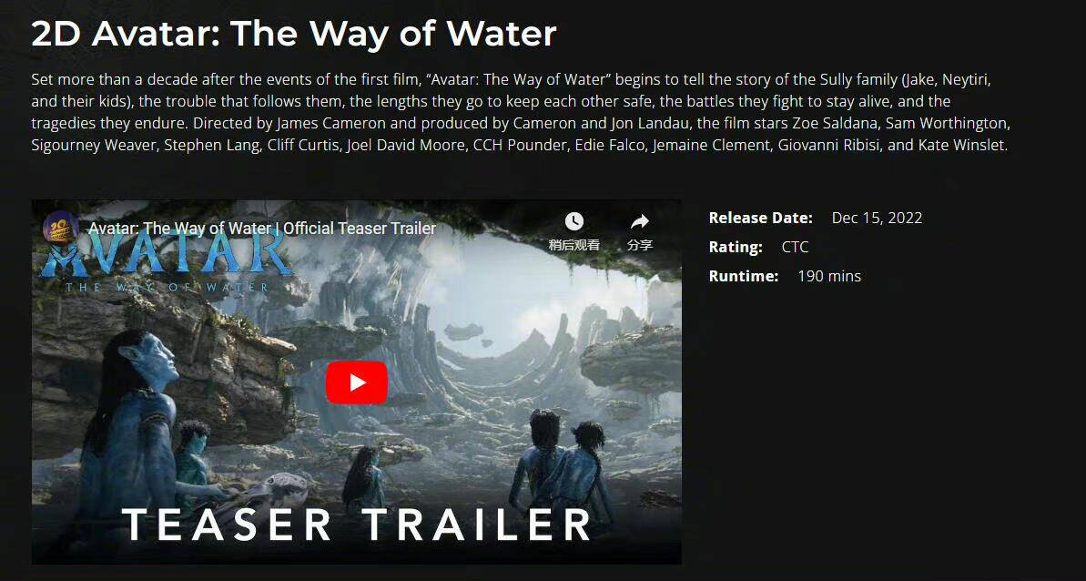 据多家资料网站显示,詹姆斯·卡梅隆执导的《阿凡达2:水之道》片长为190分钟,《阿凡达2:水之道》将于12月16日在美国上映。