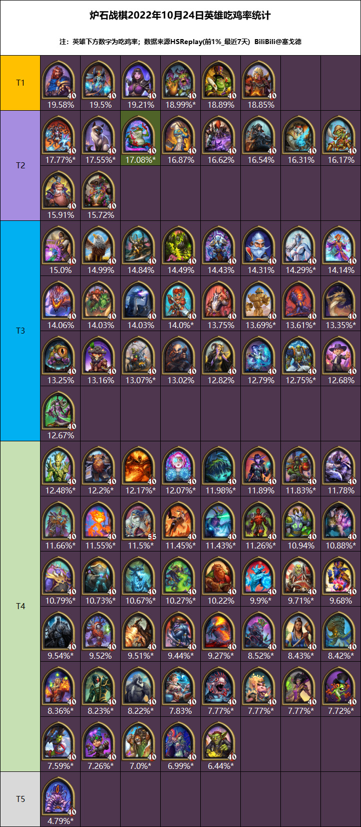 本周中位局前50%玩家(积分6100+,约180万场对局)的英雄均场排名和吃鸡率:
