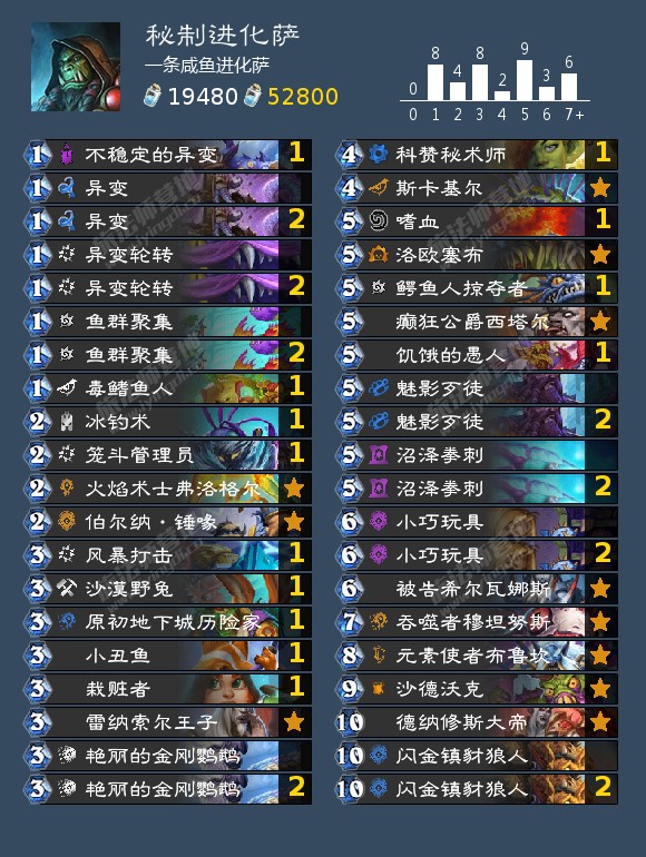 大家好,我是咸鱼进化萨,战网ID真幻影劍丨末世#5112,B站幻影剑丨末世(有标准和狂野进化萨视频),一个热衷于进化萨的骨灰级玩家。在不停的调整卡组适应环境的途中,也在许许多多的对局之后,终于在本月12号全程用进化萨(65胜率)打上前200,达成了小目标。也借此次机会把新的迷你系列的几个中立单卡都尝试了一遍,卡组如下: