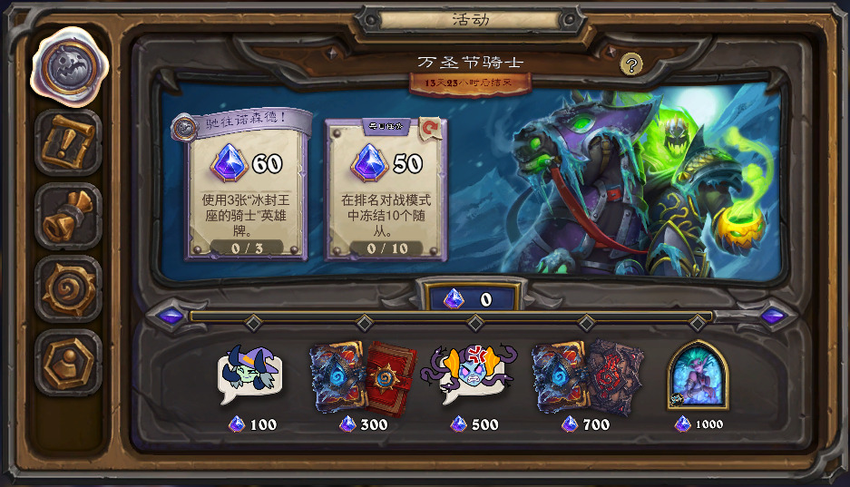 从24.6起,炉石重大节日在活动奖励方面有了进一步整合,在任务日志里有专属页面了,完整展示活动任务链及其奖励,其中任务也分成了任务链和“普通任务”两种,后者是可以每天重置一次的了。今年万圣节的奖励共计4卡包、1款构筑皮肤和2款战棋表情。