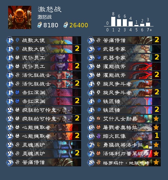 冰封王座回归的牌对这套激怒体系的战士补强非常之大,之前就提到过武器体系配合激怒体系非常完美,主要是核心是3费的灌能战斧,现在有一整套武器配合组件,灵魂熔炉可以定向检索武器,加上武器专家的特效,所以这套牌满编了四把刀。灌能战斧配合场面蹭血,铁匠锤直接砍脸打直伤,后期有活体剑刃+吼爹+英雄牌+屠戮者一卡车直伤斩杀。