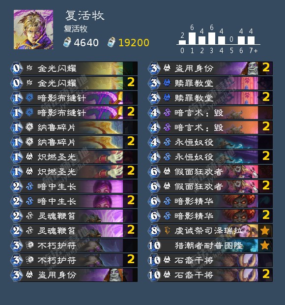 在为数不多我不卡的对局里,我就玩得这套复活牧,可惜没有一把用金光闪耀探底探到了暗影精华,这套牌一个上限就是前期3费的暗影精华直接拉出来大哥,4费接一个永恒奴役前期场面直接爆炸。