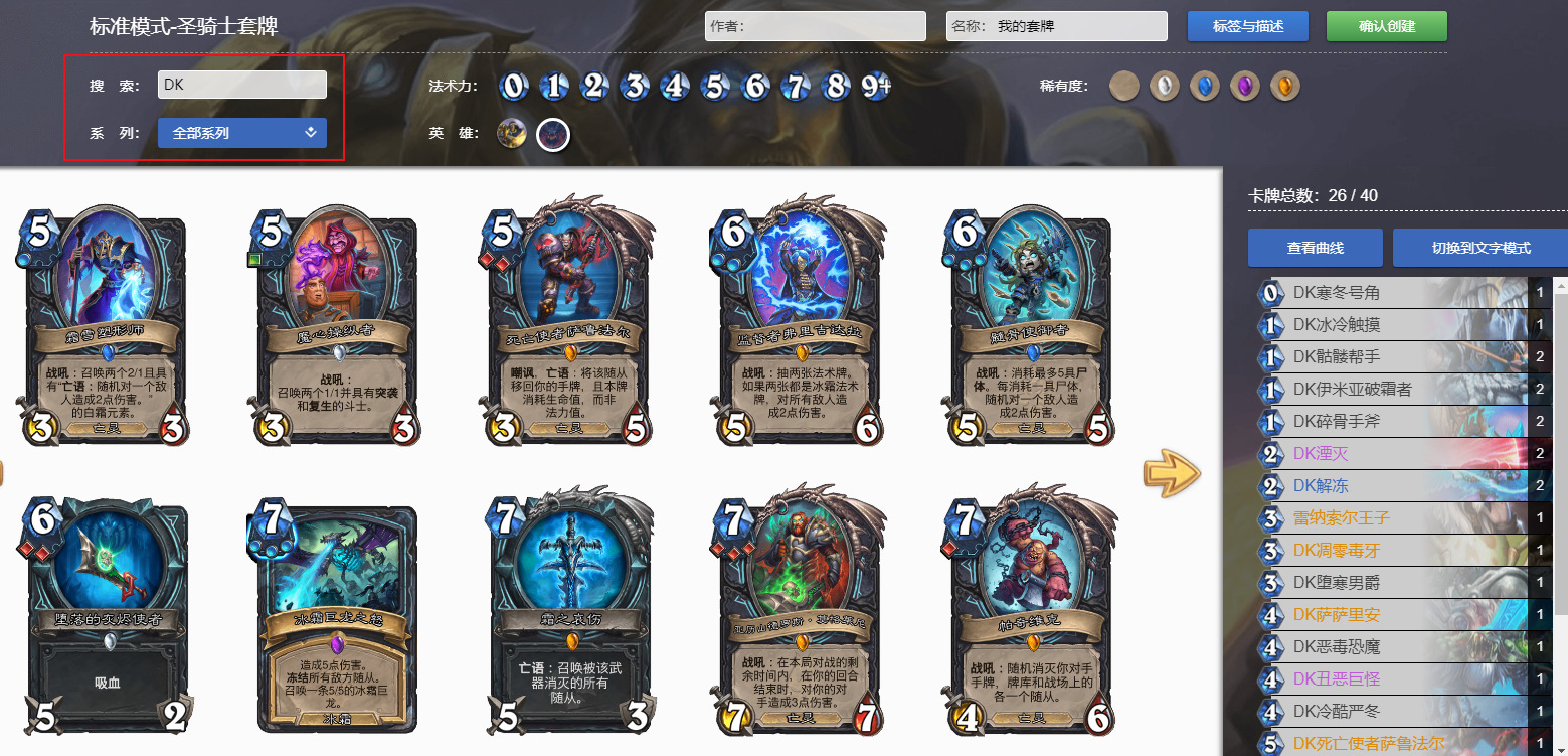 我目前已经把所有“死亡骑士”的卡牌职业归属,调整为中立卡牌,并且卡牌名都标注了“DK”前缀,这样大家就可以选择任意一个职业,然后,从搜索中找到标注“DK”前缀的死亡骑士的卡牌,这样就可以提前预先临时体验卡组构筑。