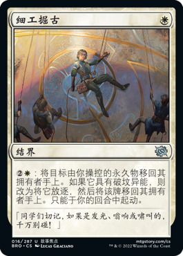 也就是说它是一个可以学到你操控生物的异能的产费神器。因为可以自己横置自己,所以能配合的空间非常大。配合虔诚德鲁伊可以无限费,甚至还是有颜色的(蓝或者绿),配合净景美洛可以把自己的牌库磨掉(虽然这样真的很费劲)。配合星界巨龙能让我猪脑过载(目前我个人理解是可以达到无限3/3产U龙+无限其他非生物永久物+一个产U神器,反正这个问题已经丢群里了,回头我搓出来我就说我赢了,大家肯定也会心领神会)。