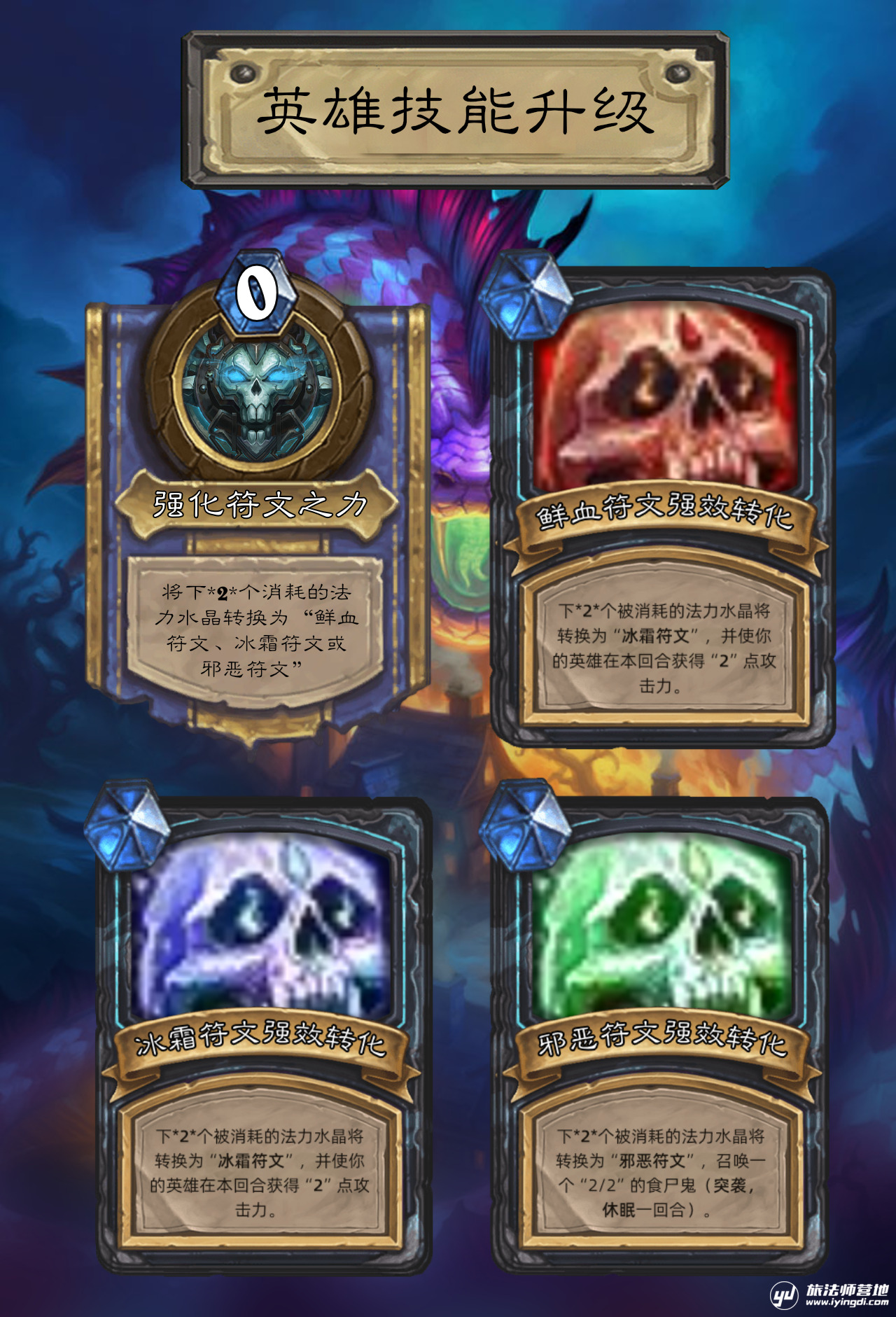 因此,你会在上图的英雄技能中发现其他各种职业的技能特点,比如从3种效果中选择其中之一的“抉择”,鲜血符文转化后获得1点生命值的牧师、战士的恢复能力(这里获得1点生命值是提升上限的意思,可能图中描述不是很恰当),冰霜符文转化后获得1点攻击力的潜行者、恶魔猎手的攻击能力,邪恶符文转换后相当与骑士、萨满的召唤能力(加个突袭和休眠词缀,多少类似萨满的图腾效果吧)。