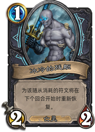 (冰冷的残躯,亡灵,消耗1枚冰霜符文)冰霜死亡骑士拥有强大的输出能力,因此符文的续航尤为重要!将具有符文增益效果的卡牌都施加于这张随从牌上吧,他会为你带来丰硕的战果!