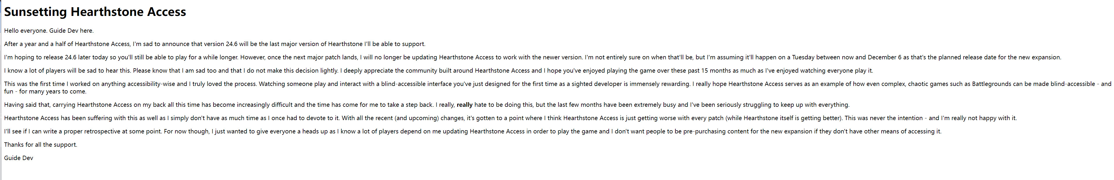 Mr. Lyons-Smith, please remember that visually impaired players, myself included, are paying customers of blizzard. Many of us spend a base $140 every four months on expansion pre-orders, plus $15 for a miniset if we don't have the gold. That's not including cosmetics, of which there are many. Indeed, many have already purchased the new expansion pre-orders and will now be requesting refunds for an expansion they can no longer play. Customers spending so much money on a product and losing access to it every few weeks would be a massive scandal under different circumstances, but in accessible gaming it's seen as an unfortunate reality. Now we are being told that because one person isn't willing to provide us a service for free, we are losing permanent access to what we've paid for. This isn't a slight on GuideDev. Our appreciation for his efforts cannot be understated, and I, for one, support his decision and wish him the best. My admonishment is directed at Blizzard, who is choosing to turn a blind eye to their customers being entirely locked out of the game they've been supporting for the past 15 months. Even those who haven't spent a cent on Hearthstone deserve to be recognized for their appreciation of their product.