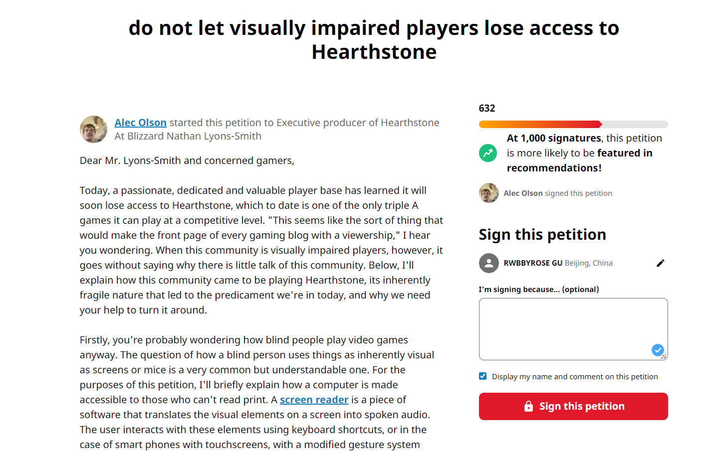 一位名为Alec Olson的网友向暴雪炉石的 Executive producer(执行制片人?我不是很确定中文中对这个职位的翻译)Nathan Lyons-Smith发起了一份众筹形式的请愿书,信中详细描述了视力障碍炉石玩家对炉石传说的热爱和游玩方式——通过一位名为Guide Dev 的开发者创造的语音插件HS Access,也介绍了目前这一群体目前的困境:由于炉石传说不断更新,尤其是即将上线的死亡骑士大更新,Guide Dev最近宣布将停止对HS Access的维护,这意味着视障玩家将失去游玩炉石传说的能力。为此,这份请愿书希望暴雪能出面,成为“第一家全面支持视障社区的 AAA 级公司”。