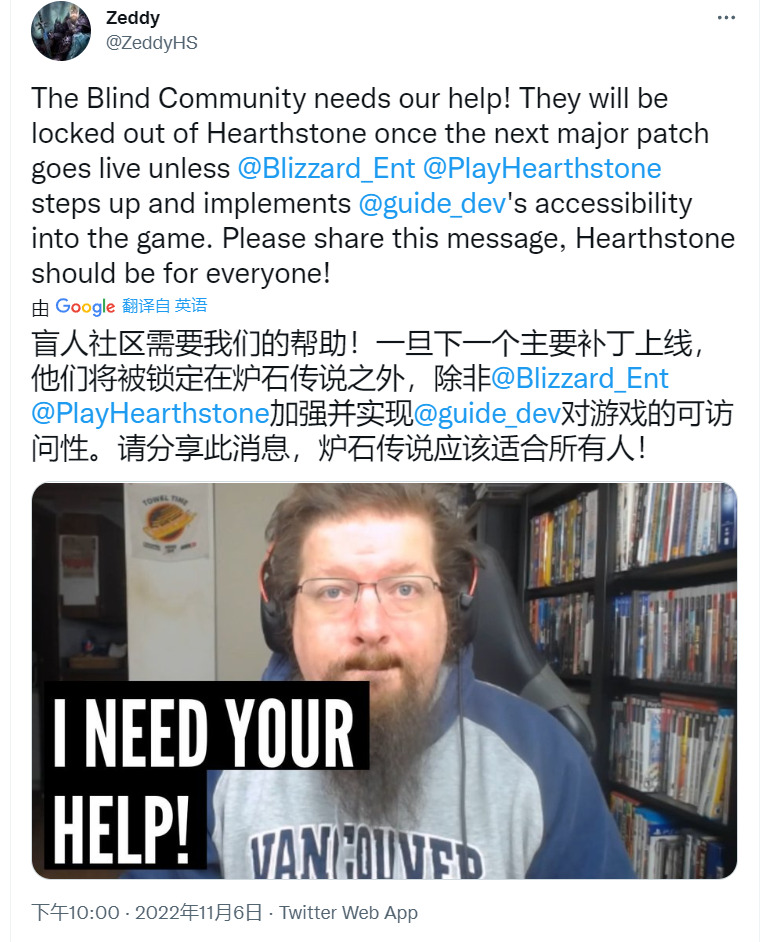 感谢营地老哥的发声https://www.iyingdi.com/tz/post/5228953,也感谢美服著名社区领袖Zeddy在他的推特和油管发布了相关消息,让我,和营地、NGA、B站等等等等更多炉石社区的炉石玩家们意识到了视力障碍炉石玩家这一特殊群体,也发现了他们目前面临的困境。