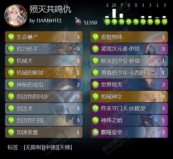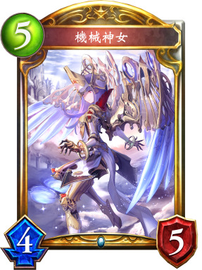 机械神女能从共鸣体系中获益,在最快第2回合、通常第4~5回合瞬念召唤登场,站场、护脸、过牌。为了尽量避免出现满足瞬召条件但牌堆中没有神女的尴尬,推荐满编。