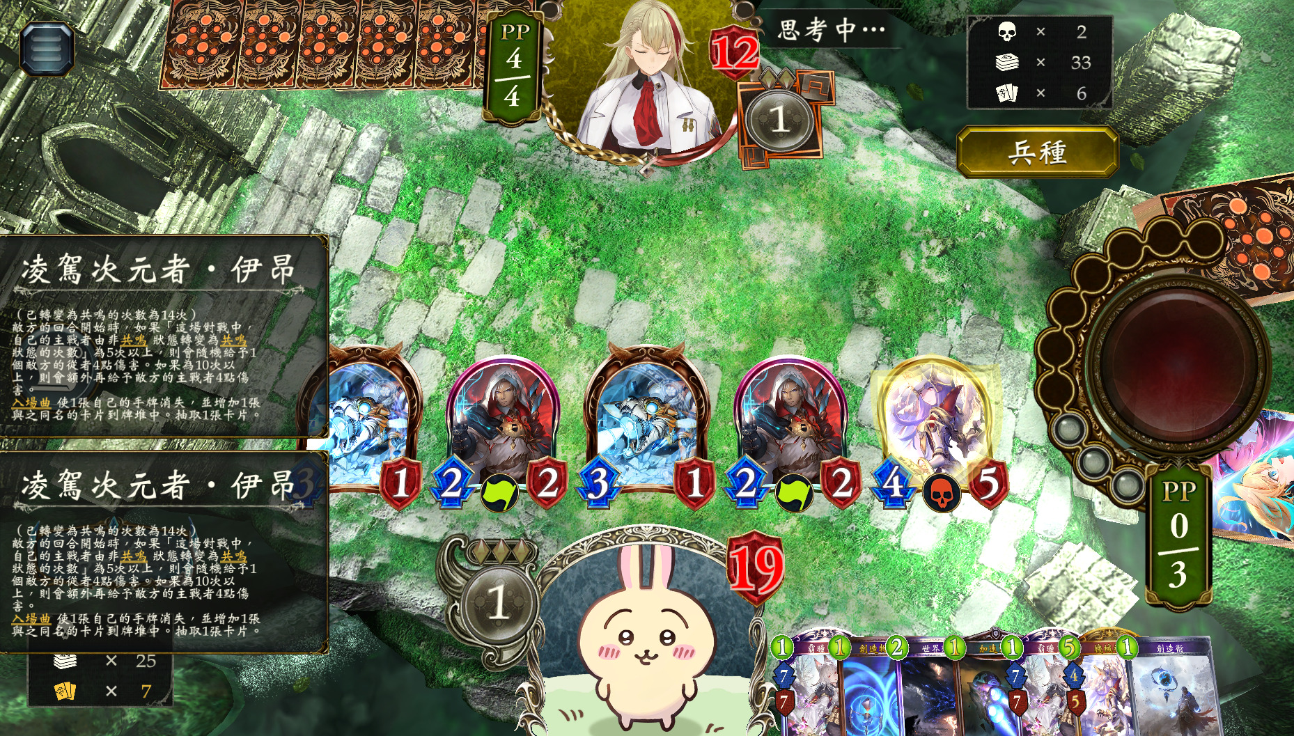 找机会通过解放、加速配合机械犬打爆发。没有解放、加速的话,则要仔细计算共鸣数,优先采取能瞬念召唤机械神女的打法。利用神女建立场面优势,保护伊昂、卡西姆等威胁,追求尽快取胜。