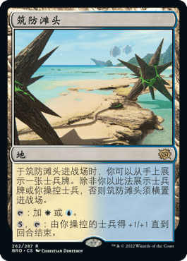 从筑防滩头可以看出威世智想要推荐白蓝士兵部族的良苦用心。这张部族地比洛温部族地循环更强大——你无须展示,而仅操控士兵就能让它竖进,它还拥有一个全体膨胀的起动式异能。这张牌在一套构筑合理的士兵套牌中基本可以视作一张竖进地,配合阿达卡荒野和幽僻庭院可以提供极佳的调色基础。如果你正在寻找一套标准套牌,可以考虑威世智铺垫了数个系列的士兵部族思路。这张牌目前的预售价格还非常低迷,入手一组可以为以后组牌提供更多的选择。