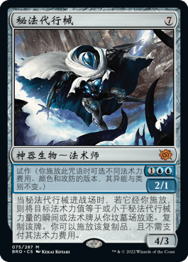 它不是迅咒法师!它是暗栖鬼怪轻量版。我曾经在bfz的标准环境无限沉迷于5费4/4威慑返照寇安甘的指命,时过境迁,万智牌已经不是赚些蝇头小利就可以获胜的游戏了。我们现在有更多可以从坟墓场返照的目标,对于摩登来说,最强的选择自然是走骨行尸或是坏灭足迹这种不能正常施放的延缓牌。但实际上,秘法代行械可能无法撼动传统的倾曳计划,因为把关键张先送进坟墓场已经是一个额外操作了,但它可以被当做planB,或是去寻找别的配合。一个已经出现在构筑中的探险(先驱同理)思路是使用蹊径创会纪的第三章异能从坟墓场施放看清真相,达到伪“一张牌2费抓三张”的效果,秘法代行械可以扩大这个小配合的使用空间。诚然,仅仅是让你抓三张牌不能给你带来胜利,我们需要找到最大化发挥代行械功效的构筑方式。