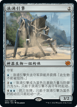 浪涌引擎人送外号“天任机器人”,它虽然本身费用更高一些,但投资费用并不高昂,一个分期付款的3/2不能被阻挡肯定是物有所值的。我个人并不认为它会适合现在比较火热的标准蓝节奏套牌,后手二回合生拍一个守军会是难以接受的节奏。不过它看起来是控制内战可用备牌,当你毫无防备换下生物去除的时候,这样一个凶猛的机器人很快就能接管比赛,这也是控制内战比较常用的小伎俩了。